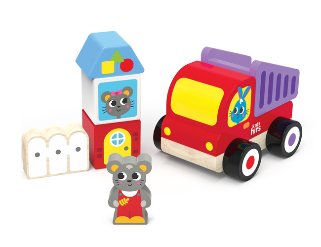 This colourful wooden building set will engage every little one in great imaginative play! The central toy of the playset is a vibrantly coloured dump truck with a workable dumper body and easy-to-roll wheels. Every toddler will enjoy pushing and pulling the construction machine, load and unload its tipper body, build a house and play with a cute mouse figure! Therewith, babies can learn colours and shapes, train fine and gross motor skills and develop their logic and cognitive skills. Kids will get lots of fun as they design, improvise and learn at play!