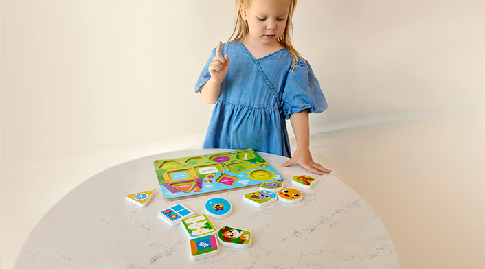 Wooden sorting puzzle board Farm Shapes introduces kids to basic shapes and assures them success in early learning. Sorting and matching puzzle pieces with their outlines, children learn geometric shapes and improve size and colour recognition. This bright farm-themed shape-fitting game helps to strengthen kids’ logical thinking and fine motor skills. Let’s get the farm in order!