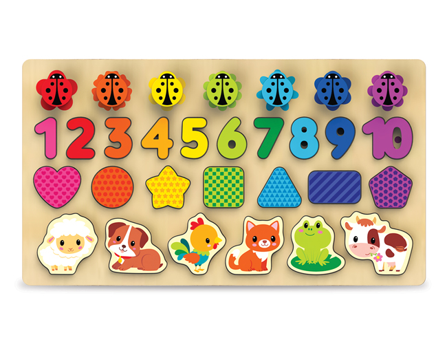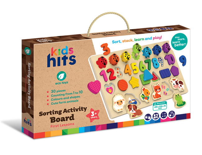 Sorting Activity Board - First Lessons - features 30 brightly-coloured wooden, durable, easy-to-grasp pieces that display numbers, shapes and farm animals. Children will match the illustrations in the slots with the insert pieces and enjoy sorting and counting at play. The colourful bugs on the board represent the 7 rainbow colours and should find their place on the flowers of the same colour. Attractive and handy, this educational toy ensures successful first lessons for young learners!