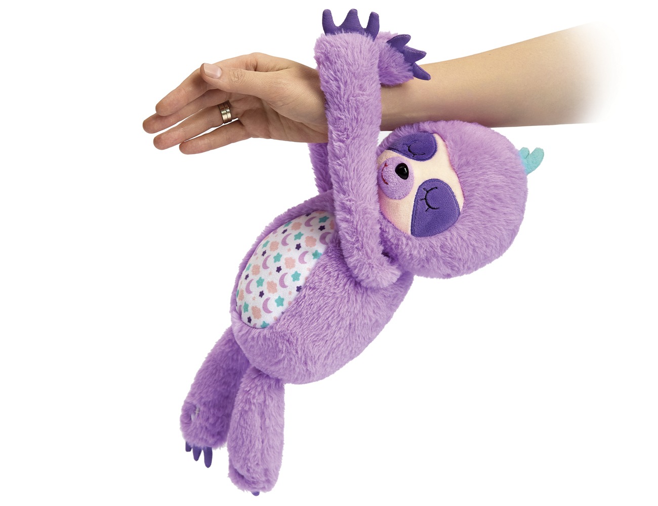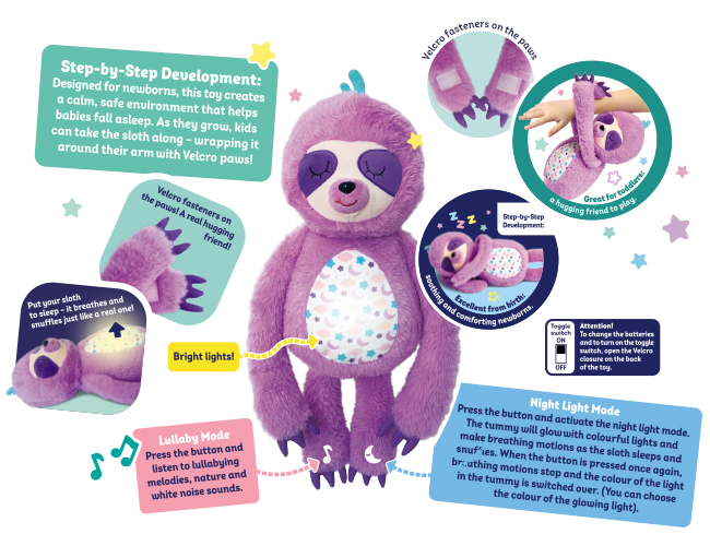 This amusing sloth is a wonderful toy featuring a night light! Its tummy glows with soft colourful lights in sync with calming lullabying melodies and nature sounds. The rhythmic breathing motions of the tummy, funny snuffles and white noise sounds help to soothe and comfort a baby and create a cosy atmosphere. Velcro fasteners on the paws are specially designed for hugs! Also, you can hang the toy around your arm, on any object in the room, and even on your bag or stroller!