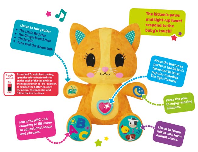Just look at this charming plush Kitten! All active play with this cute toy ensures pleasure of entertainment and happy learning! By pressing the light-up belly and soft paws of the toy, a baby can enjoy funny mixes with farm animal voices, listen to fairy tales and sweet lullabies and sing along to popular songs. As kids play and perform the kitten’s tasks, they can learn the alphabet, counting, colours and shapes, and even rules of politeness with this friendly Kitten! It’s high time to play!