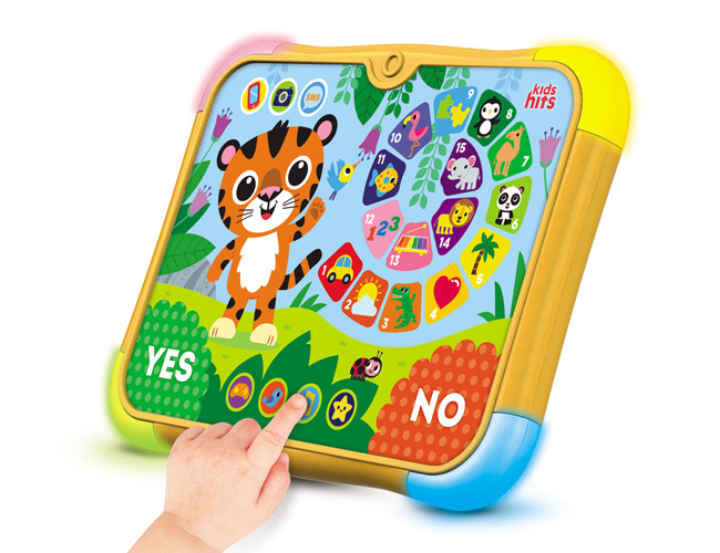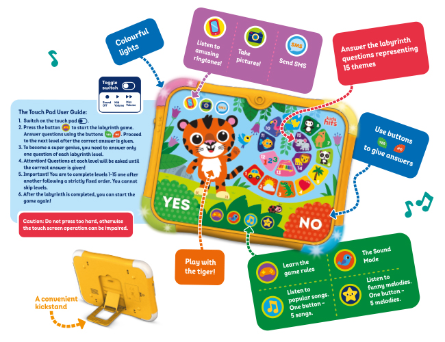 You'd hardly find on the market a toy pad with so many activities - games, tasks, sounds, melodies and even a quiz! Little geniuses will be happy to take a challenge and check their knowledge about nature, animals and plants, human body, transport, as well as train their logics and maths skills. This pad created with easy-touch technology in the brand-new shape with flashing lights and a convenient three-position kickstand will catch attention of even the most demanding consumers!